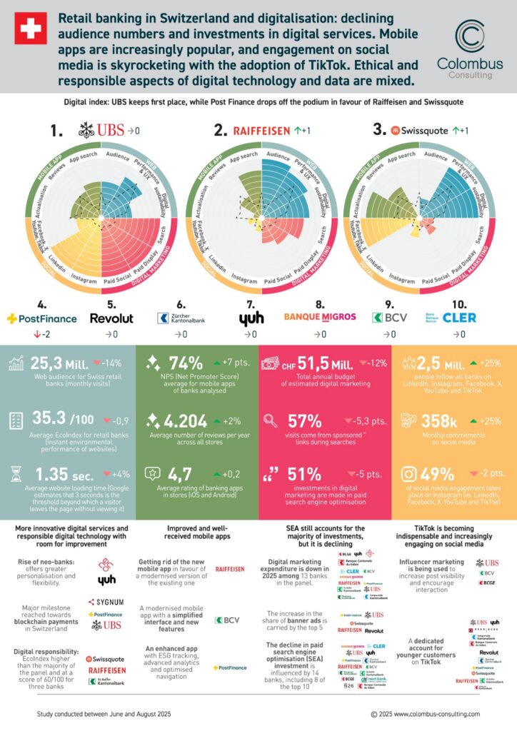 The 2025 edition of this study confirms the growing maturity of digital banking in Switzerland, while also revealing its paradoxes. Banks are consolidating their achievements – particularly in mobile apps and social media – and refocusing their investments and priorities. While UBS, Raiffeisen and Swissquote embody the success of a controlled transformation, the overall decline in web audiences and digital budgets reflects a change in cycle, with a shift towards customer value rather than technological one-upmanship.
